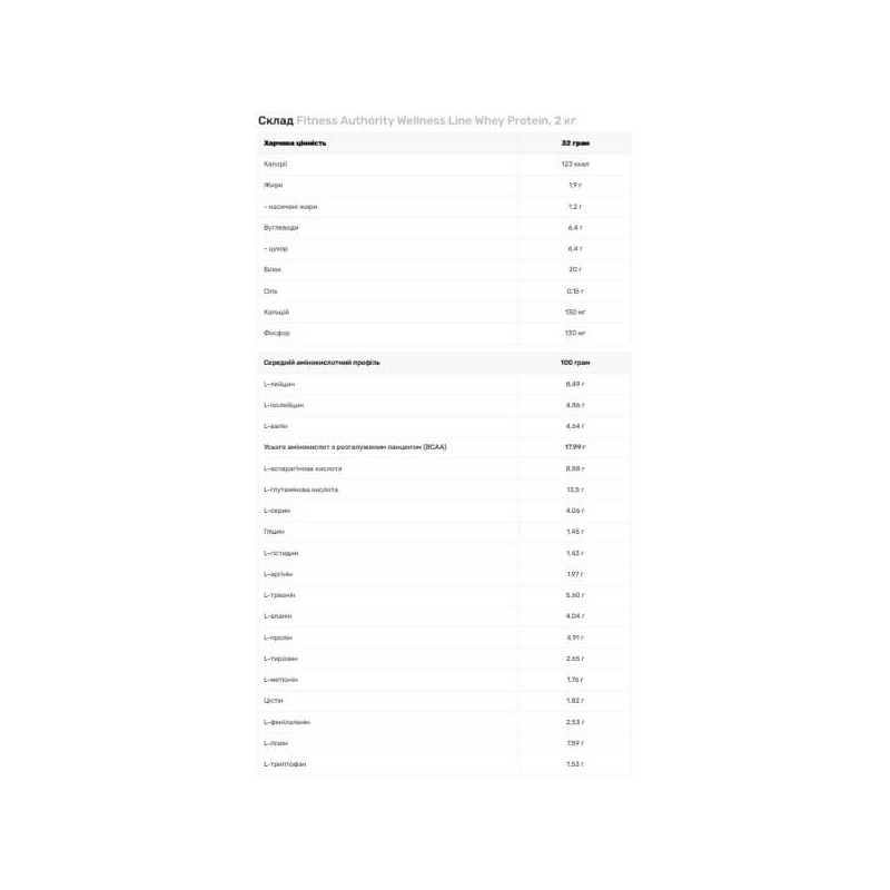 У порції порошку Wellness Whey Protein від Fitness Authority масою 32 г міститься: