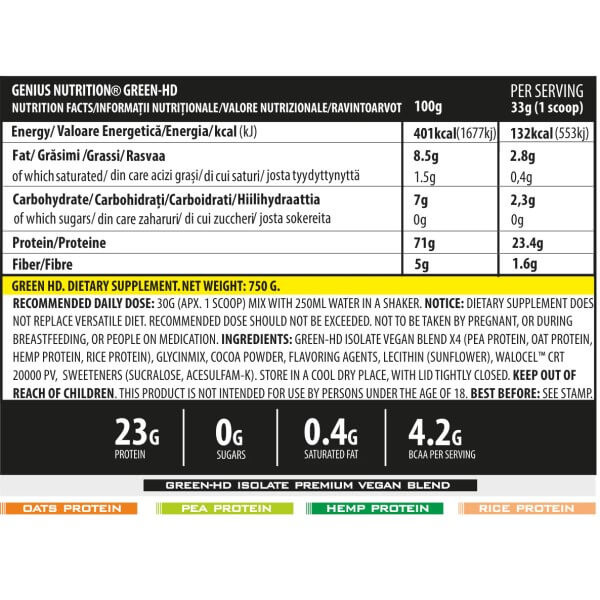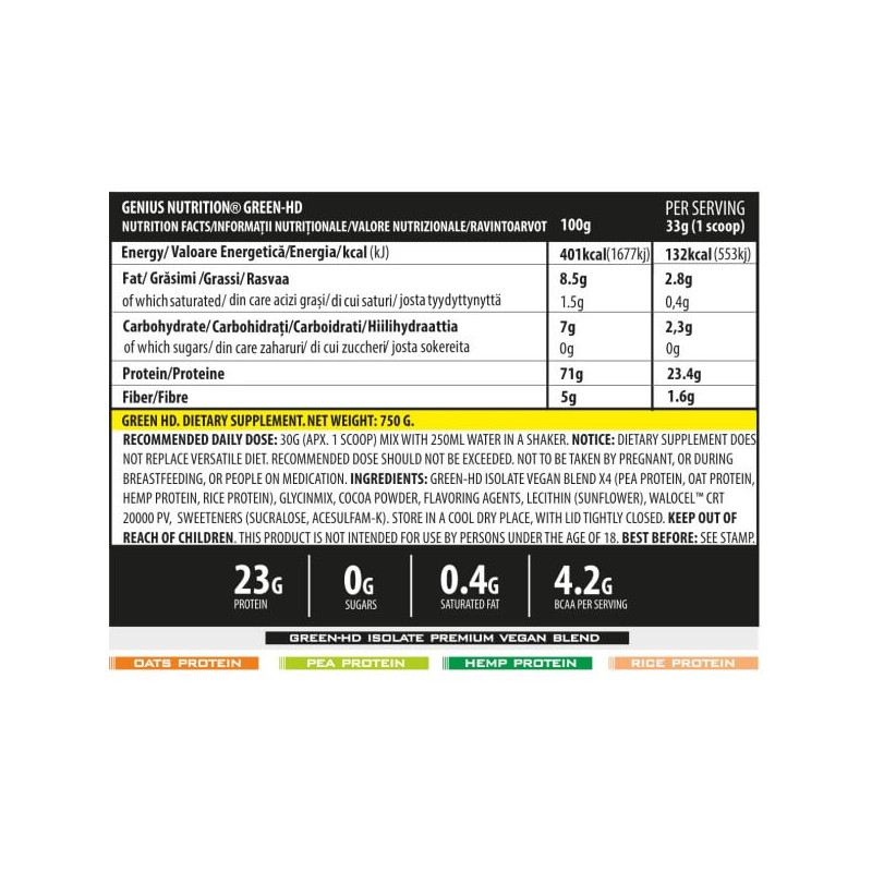 Green-HD від відомого бренду з Європи Genius Nutrition – повністю рослинний протеїновий продукт, основу якого становить мікс натуральних білків з гороху, рису, вівса та конопель, отриманих шляхом ферментації первинної сировини та наведених в оптимальну швидкозасвоювану форму ізоляту.