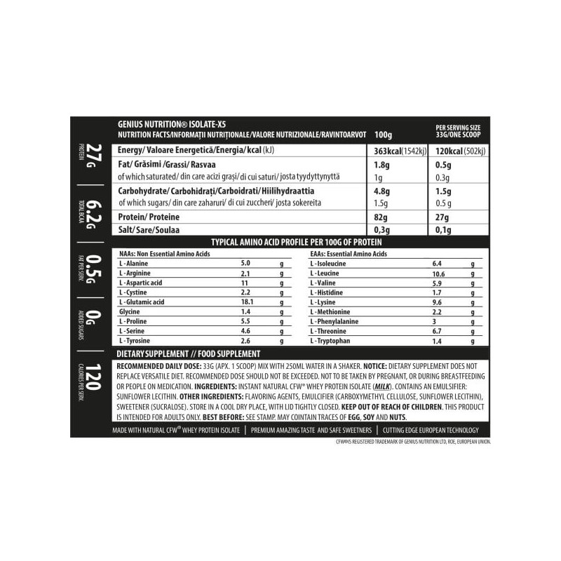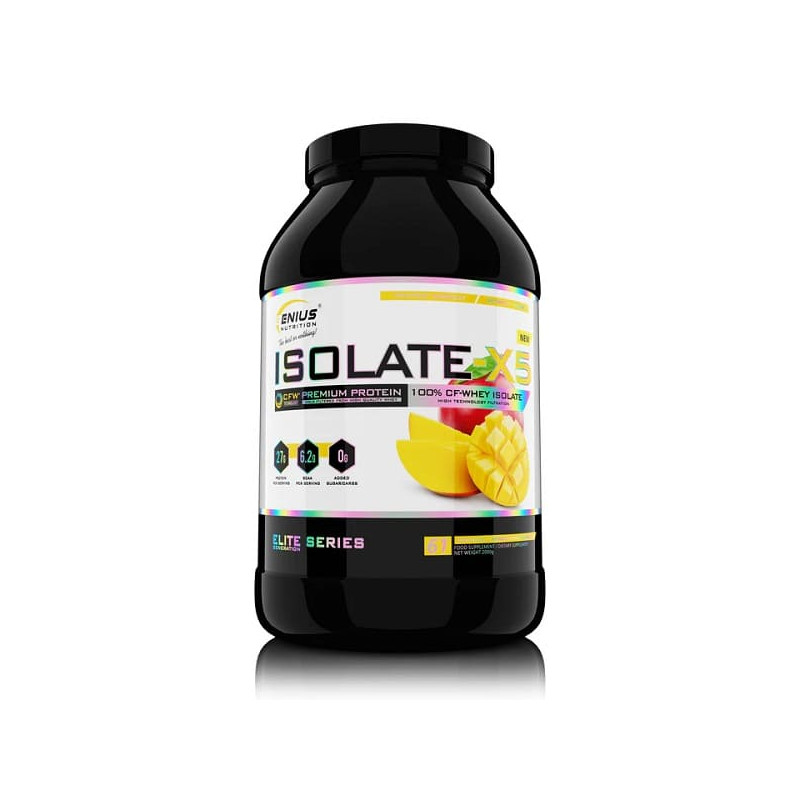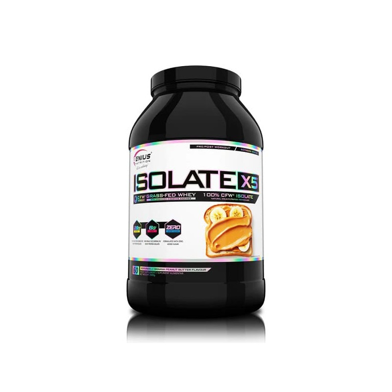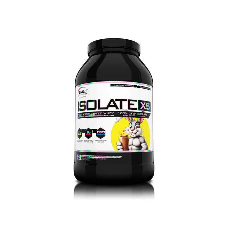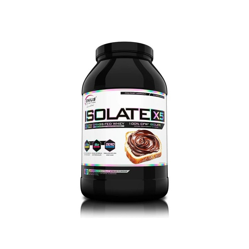 Isolate-X5 від популярного європейського бренду Genius Nutrition – якісний ізолят сироваткового білка з низьким вмістом цукру, жиру та лактози. Він отриманий з перевіреної натуральної сировини, очищеної від домішок із застосуванням технології холодної ультрафільтрації, має чудову засвоюваність та профіль з 18 амінокислот.