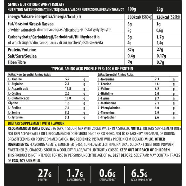 iWhey Isolate – натуральний протеїн чудової якості від європейського бренду Genius Nutrition. Його основу становить інноваційний ізолят сироваткового протеїну, що пройшов очищення методом природної фільтрації. Екологічно бездоганне молоко, отримане від корів, вирощених на природних кормах без синтетичних добавок, антибіотиків, пестицидів, гормонів та ГМО, а також збалансований амінокислотний профіль, мінімальна кількість лактози та цукру відповідають за безпеку та ефективність продукту. А порошкова форма та вишуканий насичений смак – за комфорт та задоволення від кожної порції.