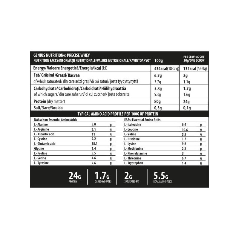 Протеїн Precise Whey від Genius Nutrition – ідеальне доповнення до щоденного раціону спортсменів, людей, які ведуть активний спосіб життя або зайняті важкою фізичною працею, тих, хто тривалий час дотримується дієт з низьким вмістом білка, а також пацієнтів на стадії реабілітації після поранень, травм, хвороб , оперативних втручань.