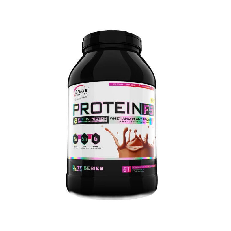 Protein-F5 від виробника Genius Nutrition – унікальний протеїновий комплекс, до складу якого входять одразу 5 видів білків. Це сироватковий концентрат, молочний протеїн, соєвий ізолят, ізолят яєчного білка та гороховий ізолят. Збалансоване поєднання різних форм тварин та рослинних протеїнів забезпечує максимально широкий амінокислотний профіль та вітамінно-мінеральний склад. А ще – гарантує поступове рівномірне надходження білка до крові, оскільки перелічені види протеїнів мають різний час розщеплення та засвоєння.
