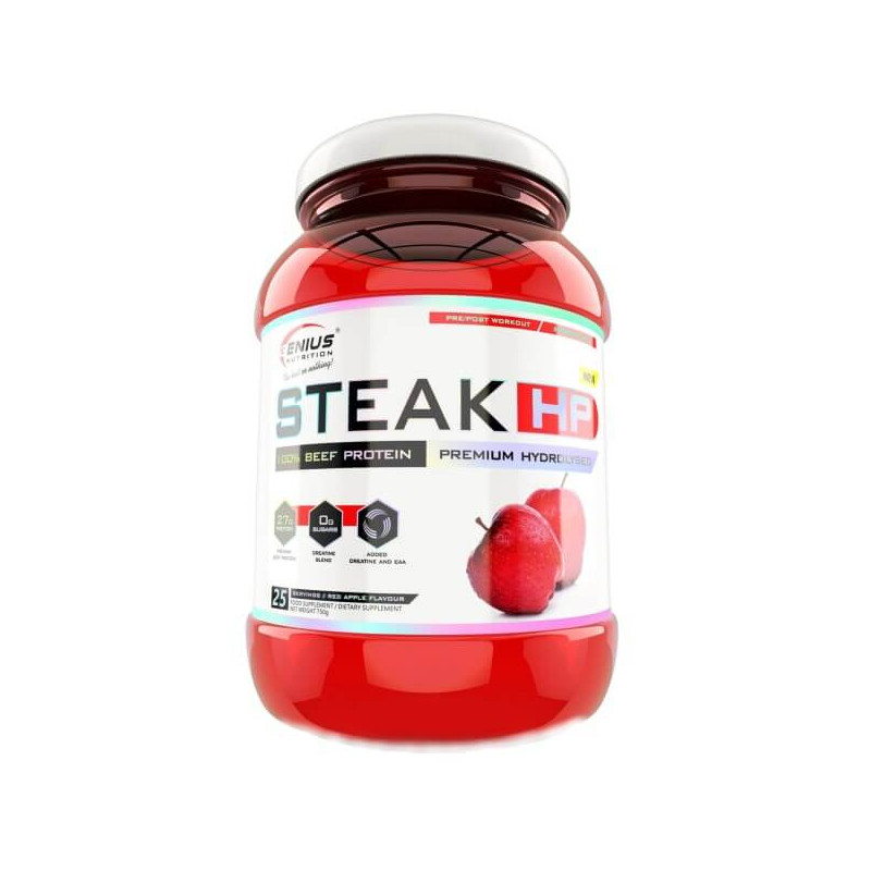 Steak-HP від виробника з Європи Genius Nutrition – протеїнова біодобавка, основу якої становить гідролізат яловичого білка. Вона виготовлена з високоочищеної натуральної м'ясної сировини, представлена у вигляді однорідного швидкорозчинного порошку і, на відміну від більшості яловичих протеїнів, має приємний освіжаючий смак без специфічного присмаку та післясмаку.