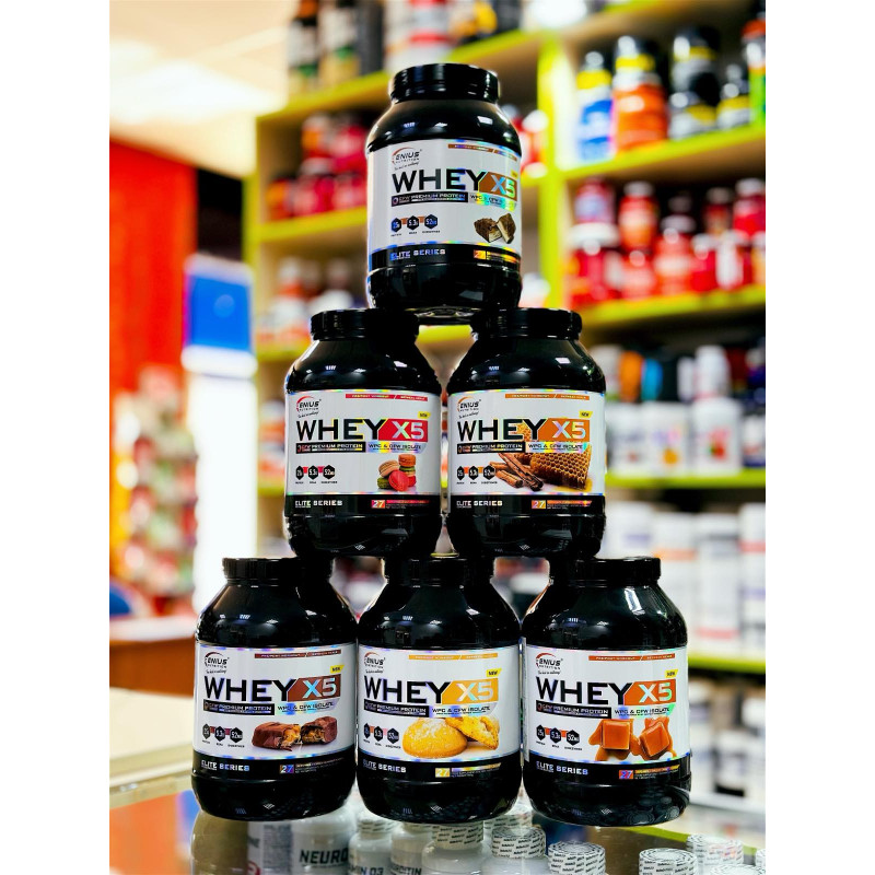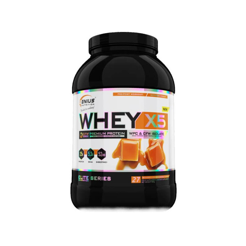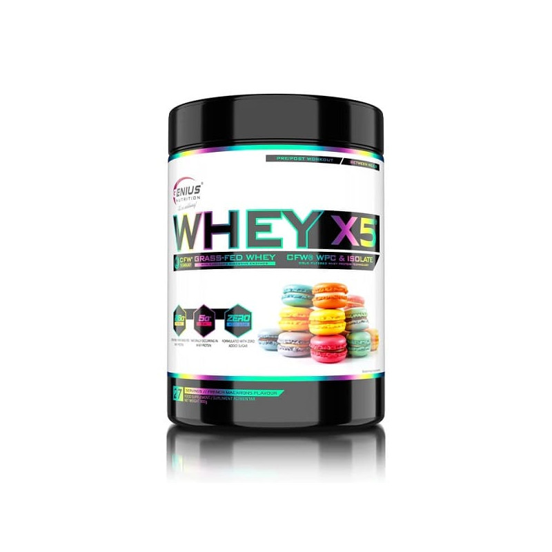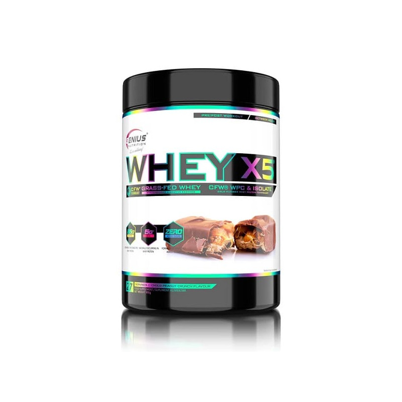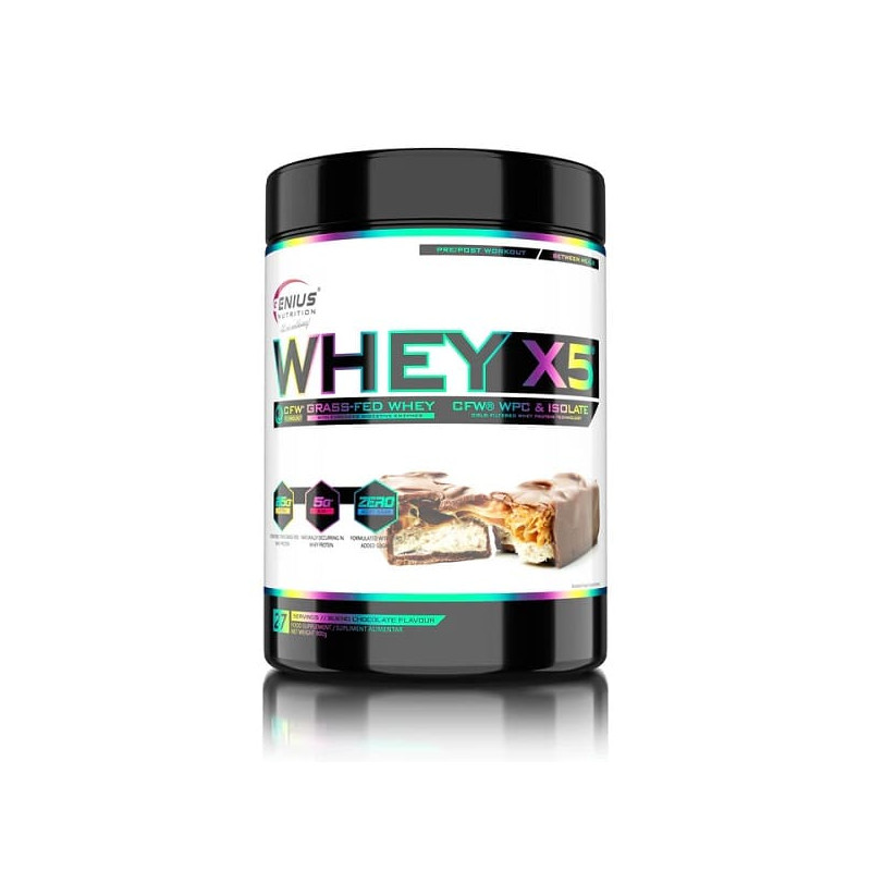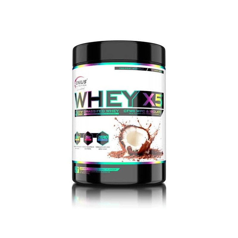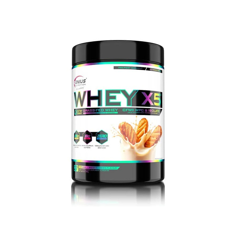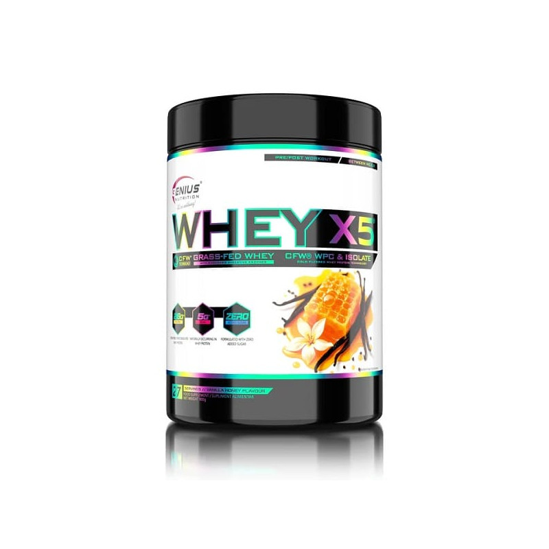 Whey-X5 від відомого європейського бренду Genius Nutrition – збалансований мікс ізоляту та концентрату високоякісного сироваткового протеїну, отриманого з цільного коров'ячого молока щадним методом холодної ультрафільтрації. Така обробка дозволяє максимально зберегти в готовому продукті всі корисні речовини - замінні і незамінні амінокислоти, вітаміни, мінерали, імуноглобуліни. Додатково до складу введено травні ферменти у вигляді запатентованої авторської формули Digezyme.