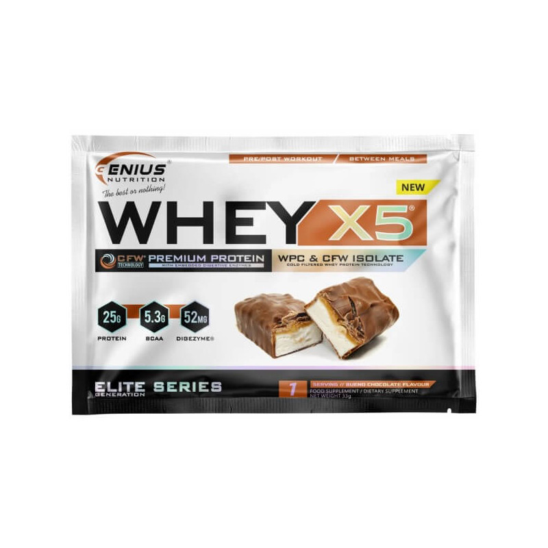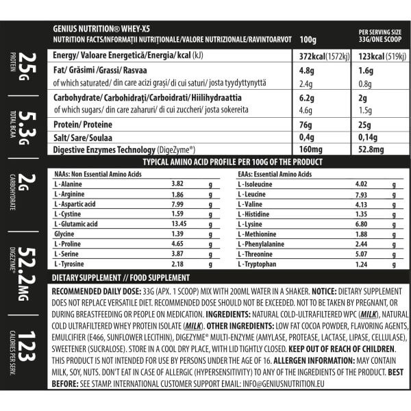 Whey-X5 від відомого європейського бренду Genius Nutrition – збалансований мікс ізоляту та концентрату високоякісного сироваткового протеїну, отриманого з цільного коров'ячого молока щадним методом холодної ультрафільтрації. Така обробка дозволяє максимально зберегти в готовому продукті всі корисні речовини - замінні і незамінні амінокислоти, вітаміни, мінерали, імуноглобуліни. Додатково до складу введено травні ферменти у вигляді запатентованої авторської формули Digezyme.