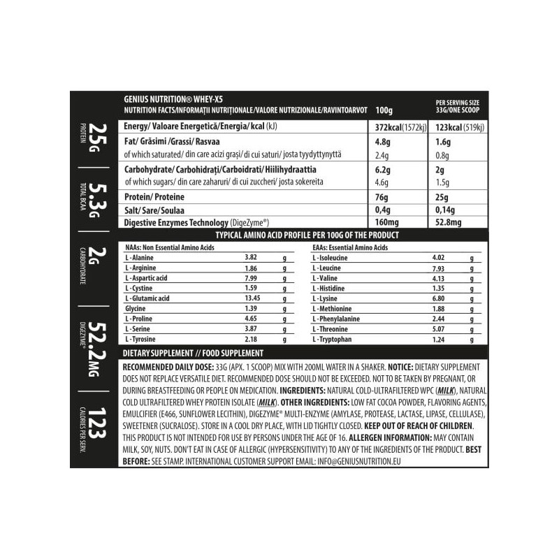 У порції дієтичної добавки Whey-X5 від Genius Nutrition (33 г сухого порошку) міститься: