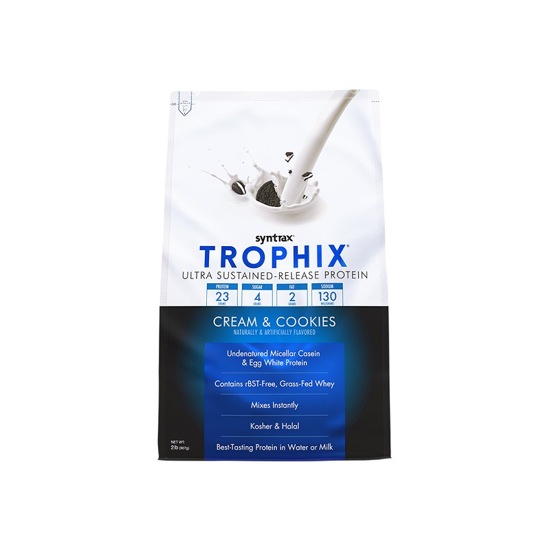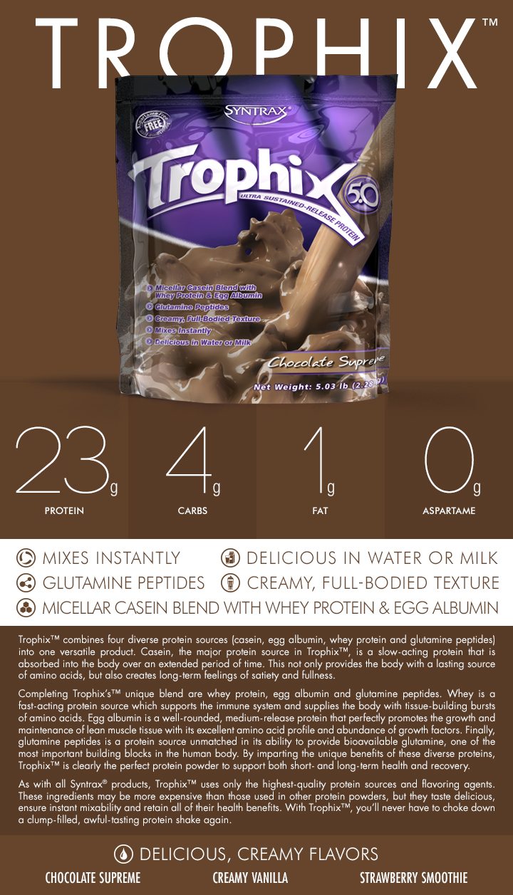 Завдяки високому вмісту саме казеїну, Trophix відноситься до казеїновим білків і ідеально підходить для спортсменів, яким важливо довгий засвоєння протеїнів, тривале почуття ситості і підживлення амінокислотами.