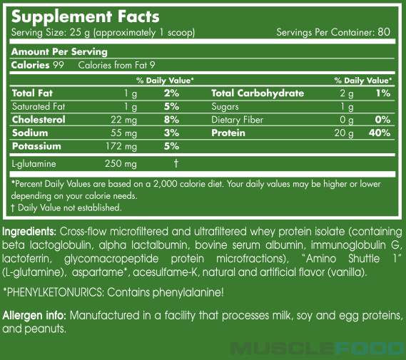 В основі добавки сироватковий високоякісний білок, отриманий з ультрафільтрованного і мікрофільтрованного ізоляту і покращений шляхом додавання ГІДРОІЗОЛЯТАМИ. Препарат не містить глютен, цукор і жири, тому відмінно вписується в низкоуглеводную дієту.