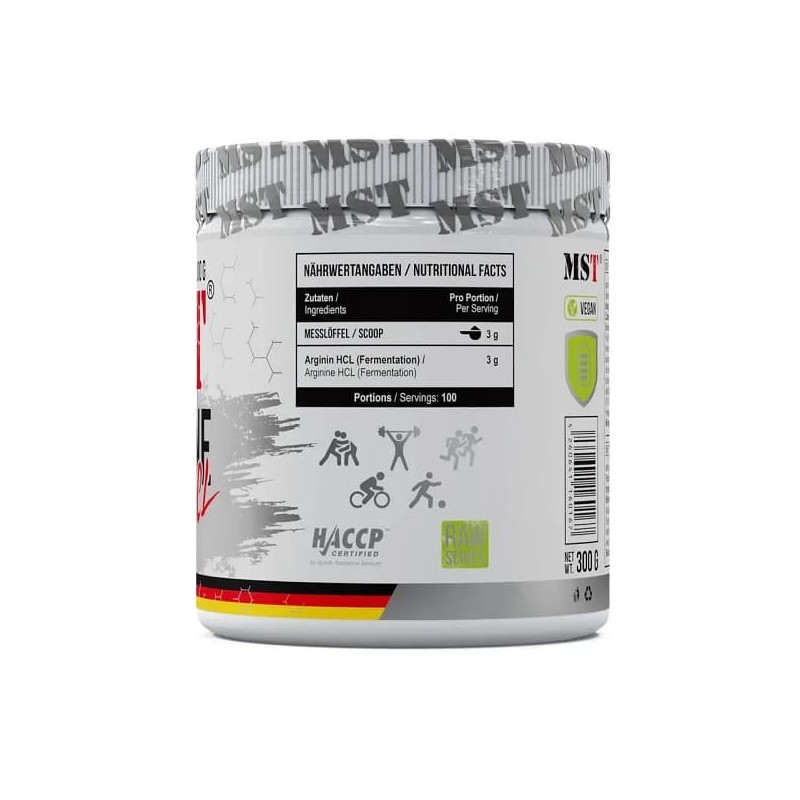Arginine HCL от производителя из Германии MST – порошковая биоактивная добавка с нейтральным вкусом, мощный, сбалансированный и безопасный источник условно заменимой кислоты аргинина. В этом продукте аргинин представлен в адаптированной, легко усвояемой форме гидрохлорида.