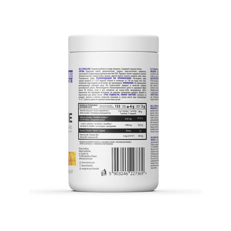 Спортивная добавка Ostrovit Citrulline на базе цитрулина малата с витамином В6 и таурином – лучший выбор для поддержки организма во время тренировок и повышения работоспособности и выдержки. В состав добавки входит яблочная кислота, которая в сочетании с цитрулином обеспечивает высокую усвояемость аминокислоты.