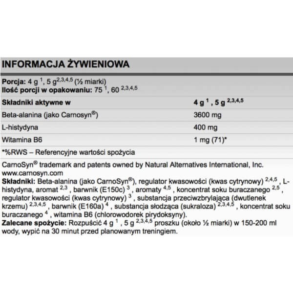 Beta-Alanine от производителя из Польши Fitness Authority – предтренировочный комплекс из линейки Performance Line, основным активным компонентом в составе которого является аминокислота бета-аланин, представленная в виде уникальной авторской формулы CarnoSyn. Она органично дополнена свободным гистидином и усилена витамином В6. Биодобавка реализуется в виде однородного порошка, превосходно растворяющегося в жидкостях и не оставляющего после смешивания комков и осадка. Широкое разнообразие вкусовых композиций позволяет выбрать вариант по собственному вкусу и гастрономическим предпочтениям.
