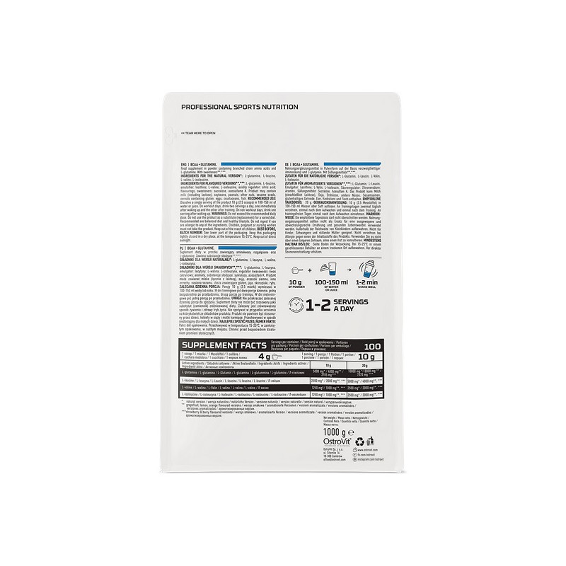 Добавка сочетает в себе аминокислоты с разветвленными цепями (BCAA) и глютамином, чтобы обеспечить максимальную поддержку для мышц во время тренировок. Продукт содержит 1000 г порошка, состоящего из L-лейцина, L-изолейцина и L-валина в соотношении 2:1:1, а также L-глутамин, который способствует быстрому восстановлению после физических нагрузок. Эта комбинация помогает снизить мышечный катаболизм, повысить выносливость и поддержать синтез белка.