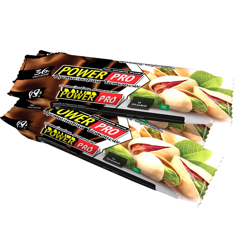 Батончик на 36% состоит из высококачественного сывороточного протеина. Дополнительная порция белка позволит стать на шаг ближе к мечте — идеальному телу, а комплекс витаминов, которые также входят в состав снека укрепят иммунитет. Фисташки — хороший антиоксидант. Эти орешки славятся свойствами уменьшать уровень сахара, предотвращать болезни сердечно-сосудистой системы и притуплять голод. Любители фисташек непременно оценят невероятно нежный ореховый вкус батончика Power Pro.