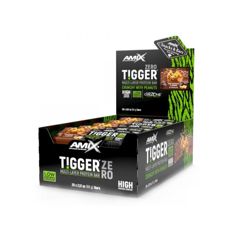 TiggerZero Multi-Layer Protein Bar от известного английского бренда спортивного питания Amix – сытный и полезный хрустящий шоколадный батончик с арахисом. Потребителю предлагается три вкуса на выбор – ванильной карамели, черного шоколада и карамели, а также карамели с арахисовым маслом.