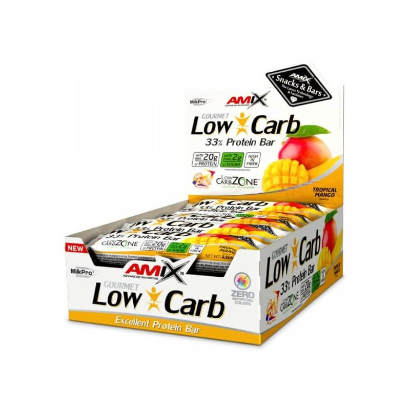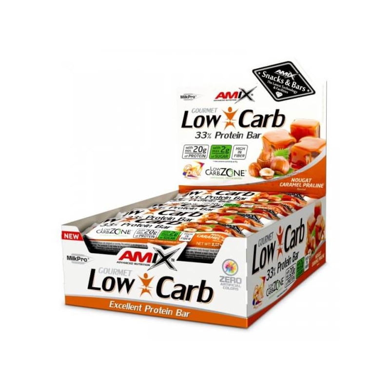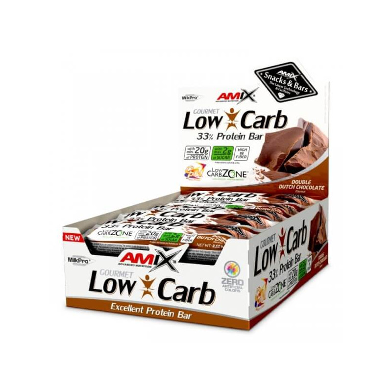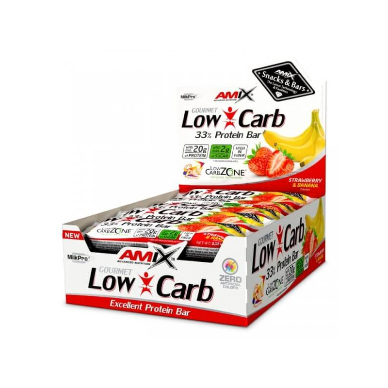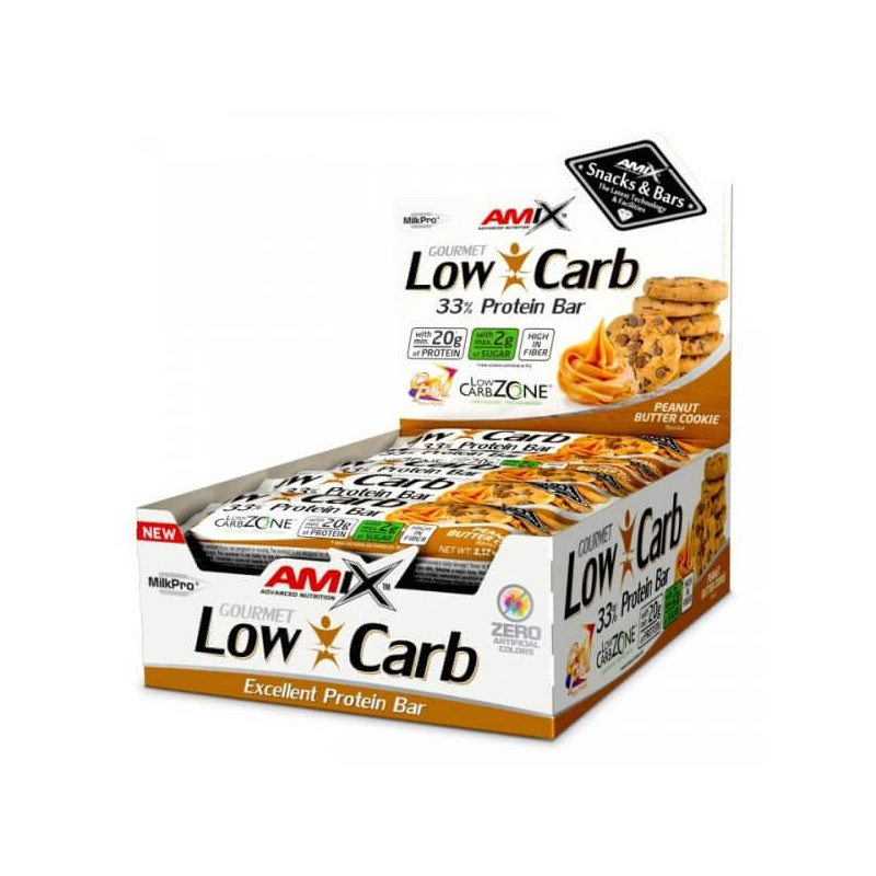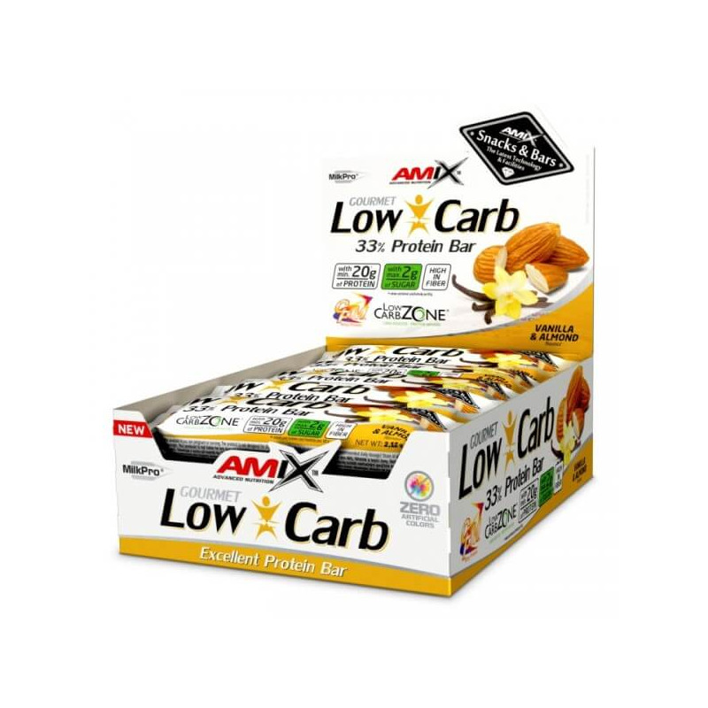 Low-Carb 33% Protein Bar от одного из лучших европейских брендов спортивного питания Amix – батончик с высоким процентным содержанием протеинов и минимальным количеством простых углеводов. В нем присутствует уникальная матрица MilkPro Protein Blend, состоящая из изолятов и концентратов белков из цельного молока и молочной сыворотки. Также в состав продукта входят очищенные пищевые волокна, полезные жиры и мальтитол в виде сиропа с разными вкусами.