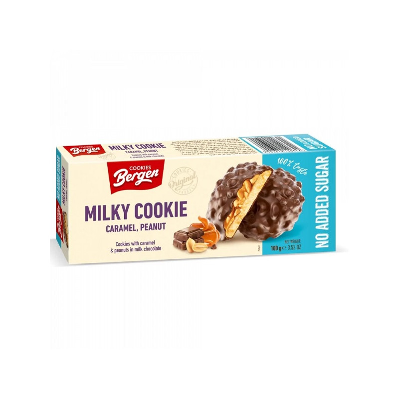Печенье молочное карамель-арахис (без сахара) Bergen – это сочетание насыщенного вкуса и контроля рациона в удобном формате.