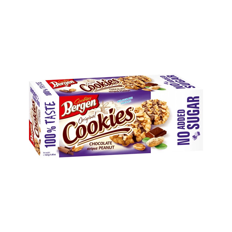 Печенье с арахисом и шоколадными полосками (без сахара) Bergen – это хрустящие перекусы с ореховым и шоколадным вкусом для ежедневного рациона.