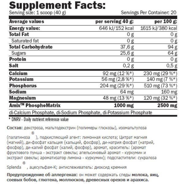 В порции изотонической добавки Isolyn Isotonic Drink от Amix массой в 40 г содержится: