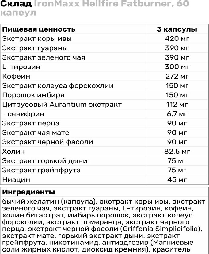 К другим компонентам Hellfire Fatburner IronMaxx входят экстракт горького апельсина и черного перца, которые могут помогать в поддержании энергетического уровня и активизации функций обмена веществ.