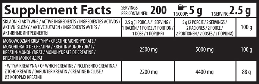 Состав добавки (в 1й порции): 2500 mg моногидрат креатина, 25 mg таурина, 2,5 mg витамина В6, кислота лимонная, пиридоксина гидрохлорид, сукролаза, ароматизатор, подсластитель.
