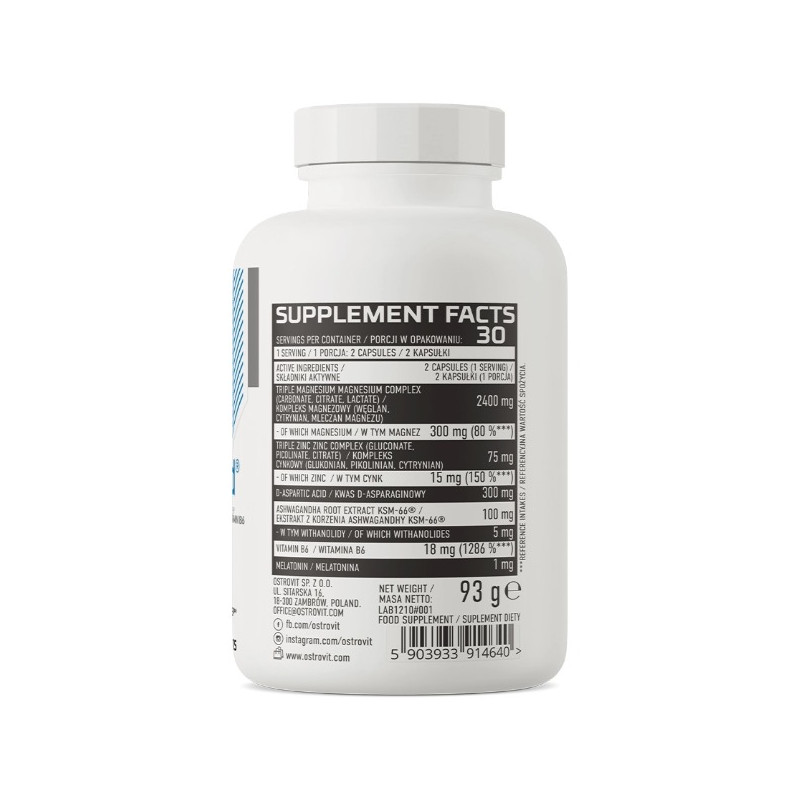 Магниевые соли лимонной кислоты (магний), оболочка капсулы (желатин, вода очищенная), D-аспарагиновая кислота (D.A.A. ), магния лактат (магний), магния карбонат (магний), экстракт корня ашвагандхи KSM-66 Ashwagandha® - 5% витанолидов, антислеживающий агент: магниевые соли жирных кислот; цинка глюконат (цинк), цинка пиколинат (цинк), пиридоксаль 5'-фосфат (витамин В6), цинка цитрат (цинк), мелатонин.