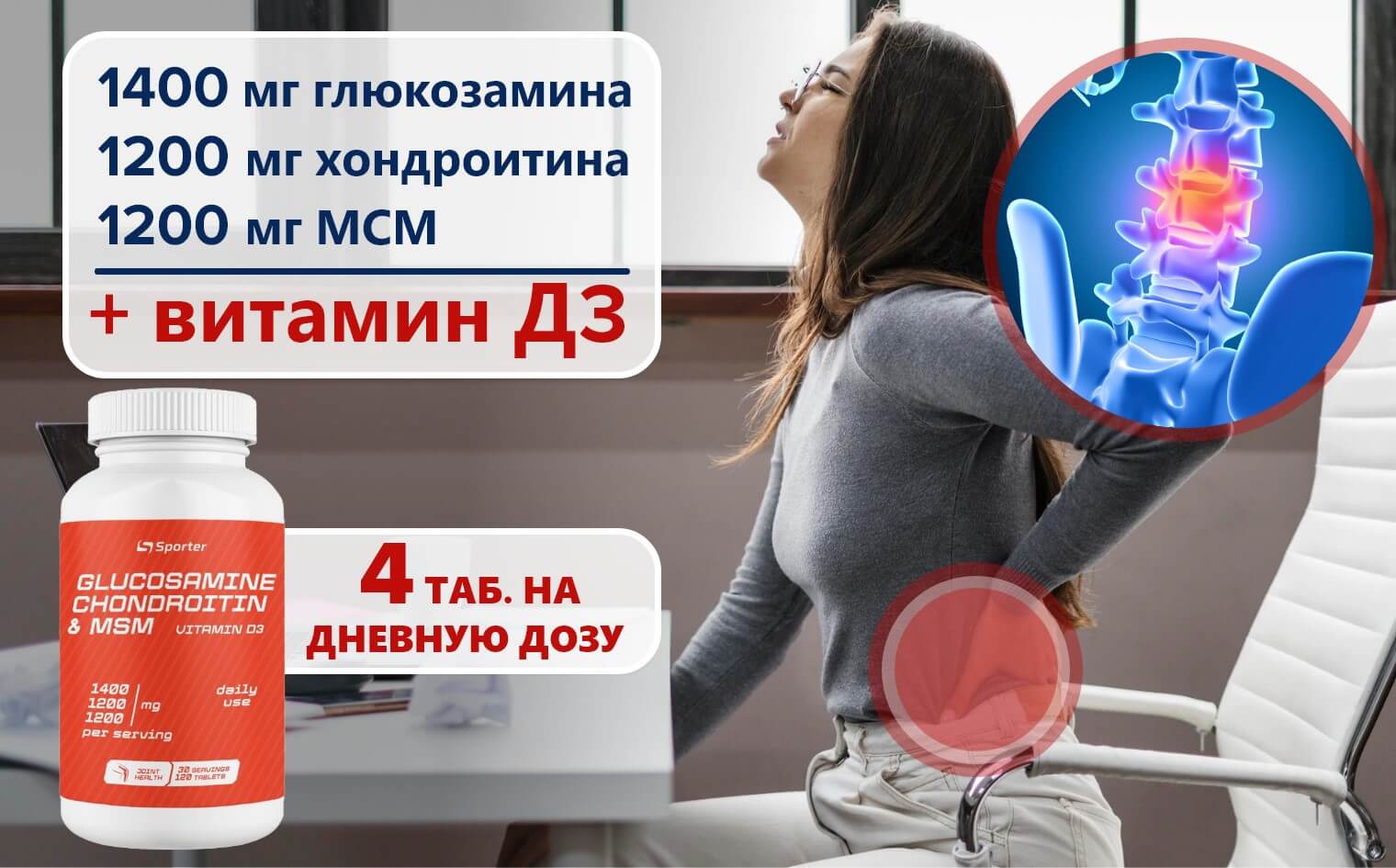 Glucosamine & Chondroitin + MSM + D3 от популярного украинского бренда Sporter – представляет собой сбалансированный комплекс, в который входят хондроитин, глюкозамин и метилсульфонилметан (МСМ). Для более выраженного эффекта эти компоненты дополнены витамином D3.
