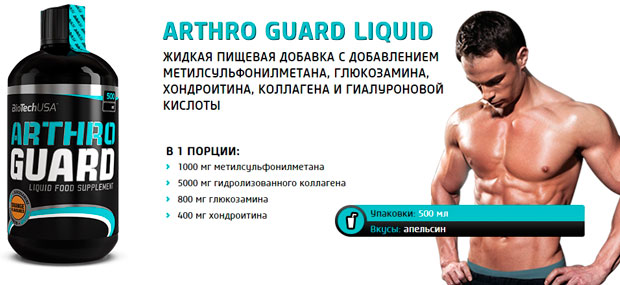 Жидкая спортивная добавка ArthroGuardLiquid – это отличный способ подпитать организм хондроитином, МСМ комплексом, коллагеном, кислотой гиалуроновой и глюкозамином – важнейшим набором веществ для набора мышечной массы и поддержки суставов и связок.
