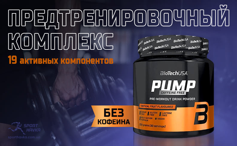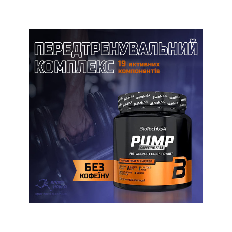 Pump Caffeine Free от BioTech – сбалансированный эффективный предтренировочный комплекс, способный качественно поддерживать необходимый уровень энергии. При этом в продукте отсутствует наиболее распространенный стимулятор – кофеин, зато есть целых 19 других активных компонентов.
