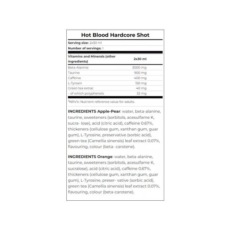 Hot Blood Hardcore Shot от венгерского производителя Scitec Nutrition – идеально сбалансированный энергетический напиток в порционных шотах. В его состав входят аминокислоты бета-аланин, тирозин и таурин, а также растительные компоненты с доказанным энергостимулирующим действием – кофеин и экстракт зеленого чая.
