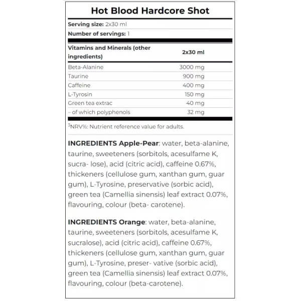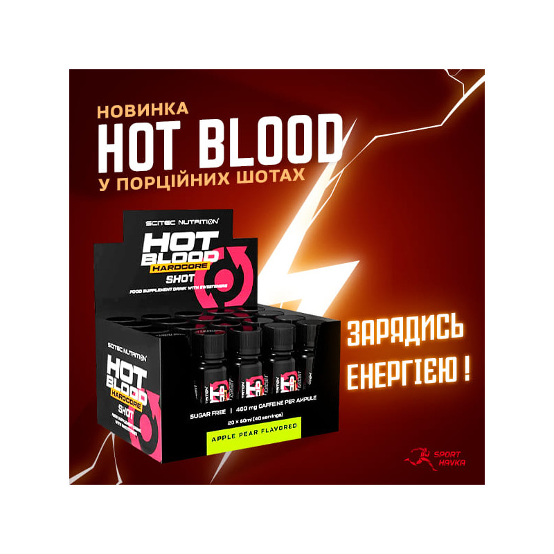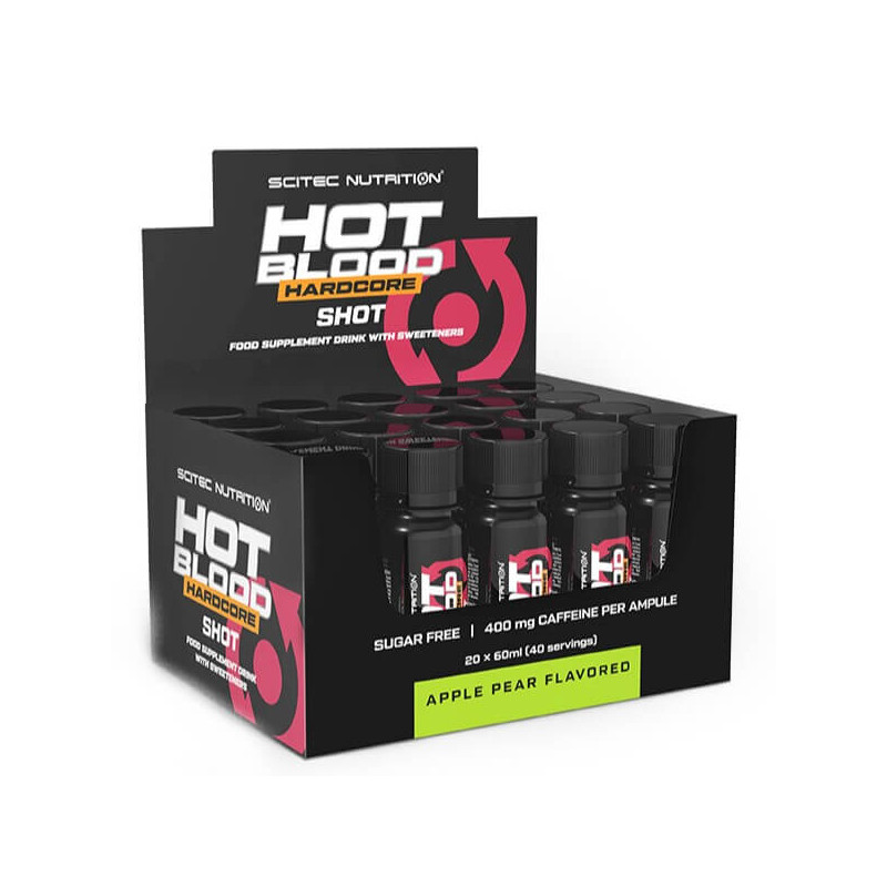 Hot Blood Hardcore Shot от венгерского производителя Scitec Nutrition – идеально сбалансированный энергетический напиток в порционных шотах. В его состав входят аминокислоты бета-аланин, тирозин и таурин, а также растительные компоненты с доказанным энергостимулирующим действием – кофеин и экстракт зеленого чая.
