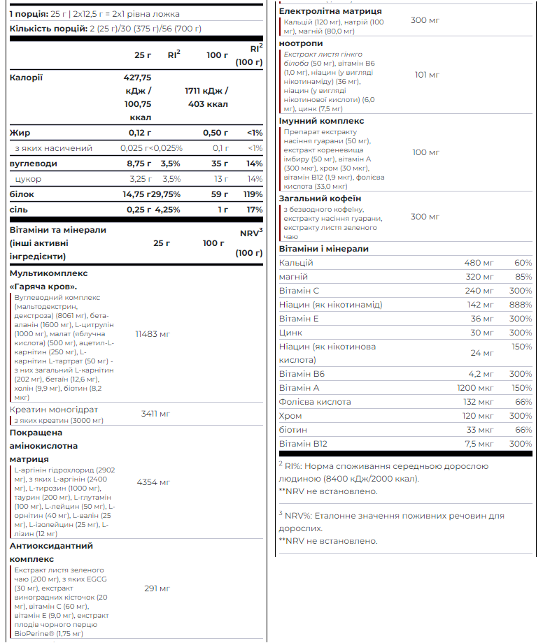 Разовая порция предтреника Hot Blood Hardcore составляет 25 г. В ней содержится:
