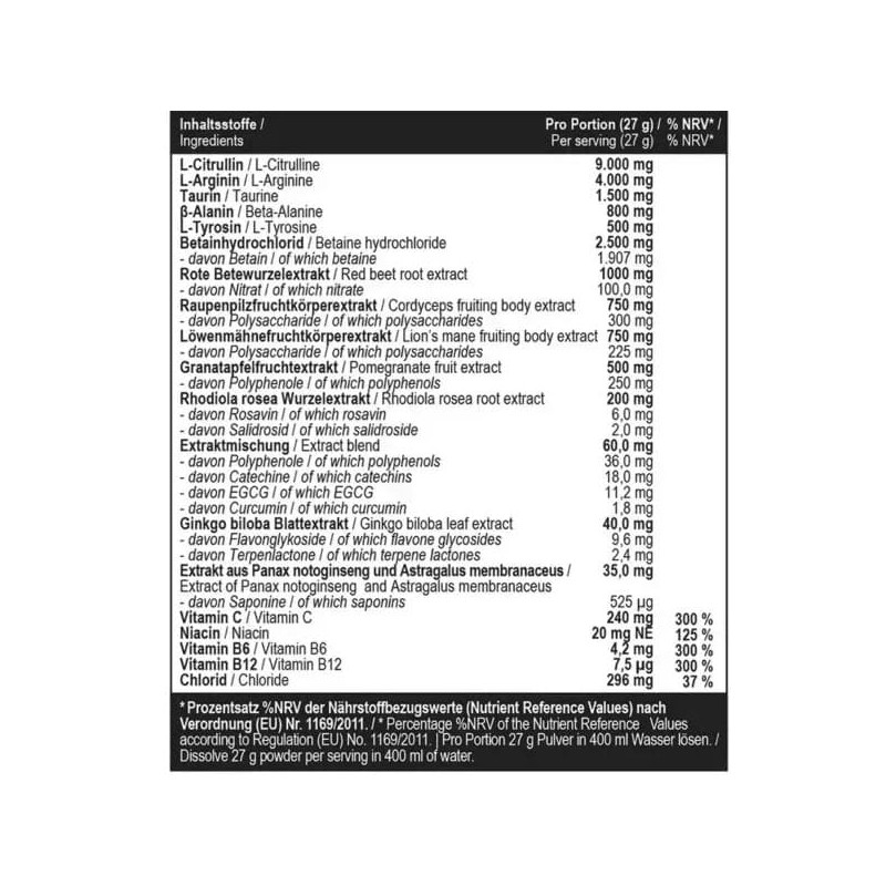 Рекомендации по применению: растворите 27 г порошка (2 мерные ложки) в 300 мл воды и употребляйте за 20–30 минут до тренировки.