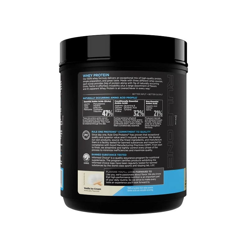 Американская компания Rule One подобрала безопасный и эффективный состав из трех форм сывороточного белка с аминокислотами, которые имеют разное время усвояемость, поэтому будут отличным строительным материалом для мышечной ткани на протяжении длительного времени.