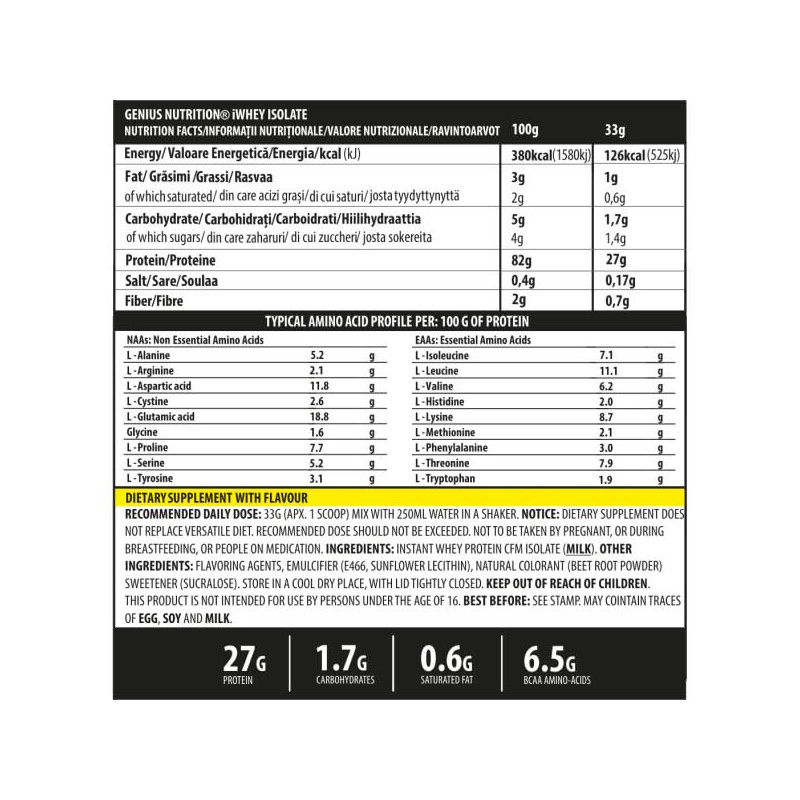 В порции порошка iWhey Isolate от Genius Nutrition массой в 33 г содержится: