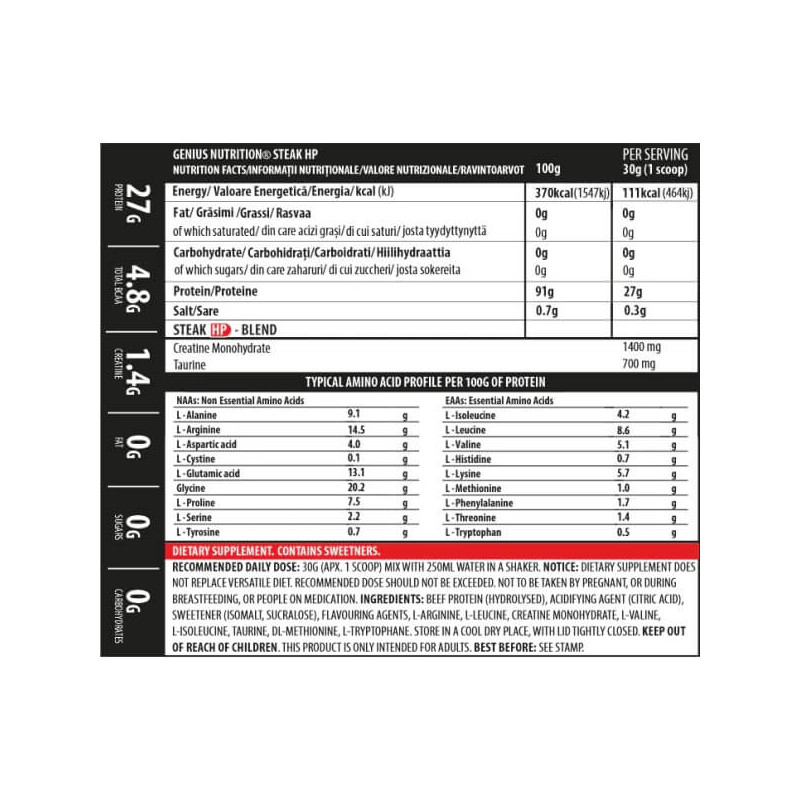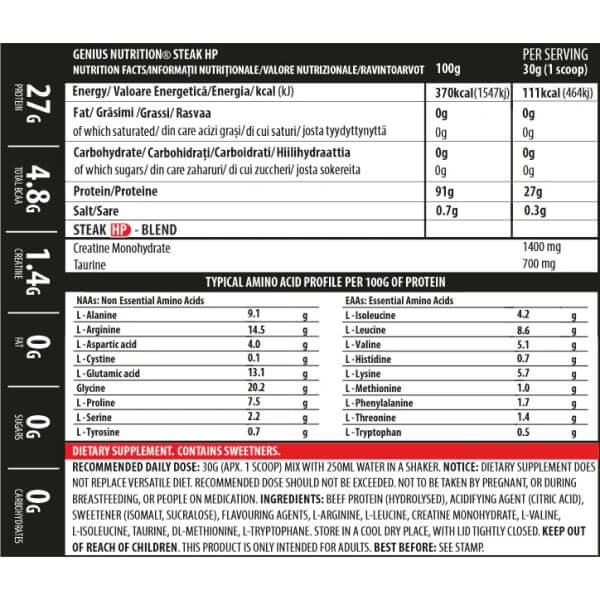 Steak-HP от производителя из Европы Genius Nutrition – протеиновая биодобавка, основу которой составляет гидролизат говяжьего белка. Она изготовлена из высокоочищенного натурального мясного сырья, представлена в виде однородного быстрорастворимого порошка и, в отличие от большинства говяжьих протеинов, обладает приятным освежающим вкусом без специфического привкуса и послевкусия.