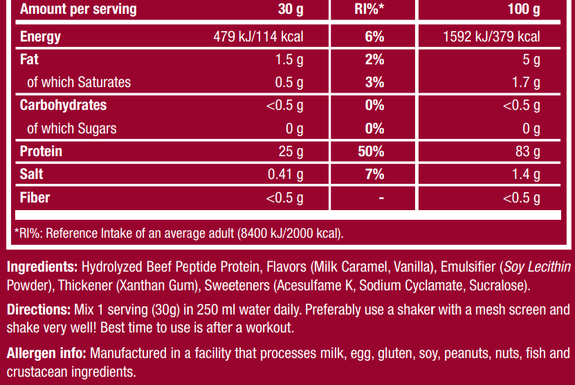 Состав протеина: говяжий гидролизованный протеин, флавониды, подсластитель, эмульгаторы.