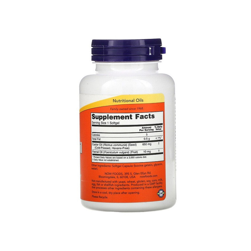 Castor Oil от производителя из США Now Foods – это касторовое масло с фенхелем в мягких гелевых капсулах. Этот растительный продукт природного происхождения, получаемый из клещевины обыкновенной, издавна известен своим мягким слабительным действием, намного более комфортным, нежели действие медицинских препаратов аналогичного назначения. При этом он почти не имеет противопоказаний и побочных эффектов.