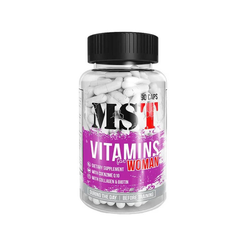 Vitamins for Women от немецкого производителя MST – комплексная биодобавка, каждый ингредиент которой способен оказывать позитивное влияние на женский организм. Микс составлен с учетом особых физиологических потребностей представительниц женского пола. Помимо витаминов и минералов, в него входят холин, МСМ, коллаген, бромелайн и другие специфические компоненты.