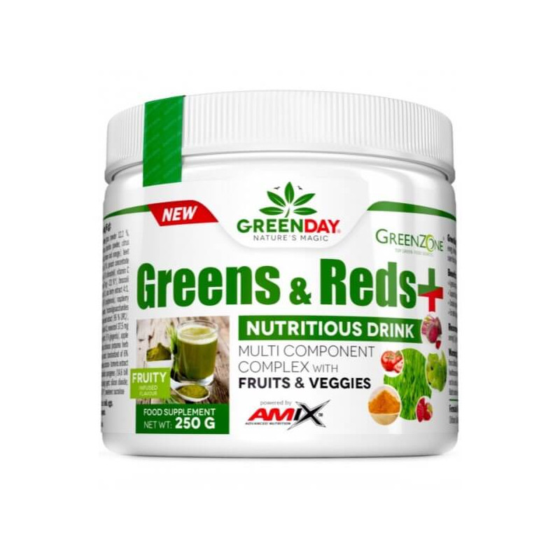 Greenday Greens & Reds от ведущего европейского производителя биодобавкок Amix – революционный комплекс суперфудов, в состав которого входят только натуральные ингредиенты. Это порошки, экстракты и вытяжки из зелени, трав, водорослей, овощей, фруктов и ягод, усиленные витаминами и пробиотиками.