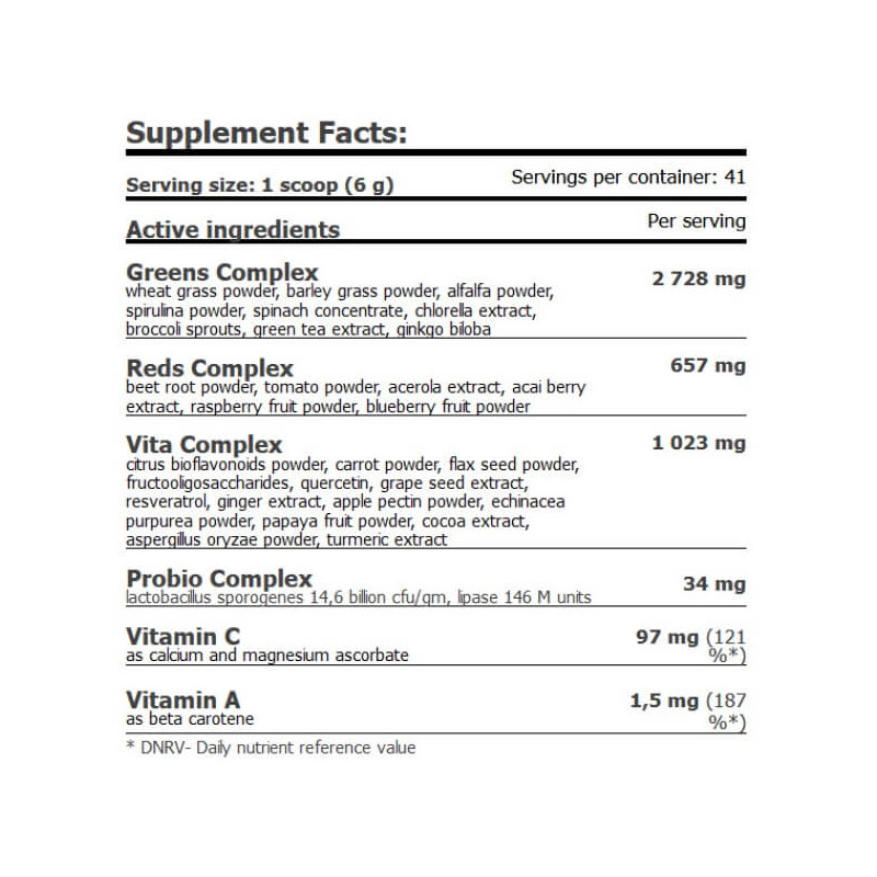 В порции Greenday Greens & Reds от Amix массой в 6 г содержится: