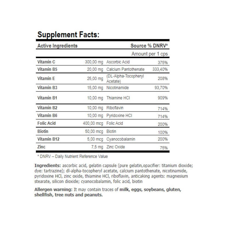 В состав одной капсулы B-Complex + Vit.C & Vit.E от Amix входит: