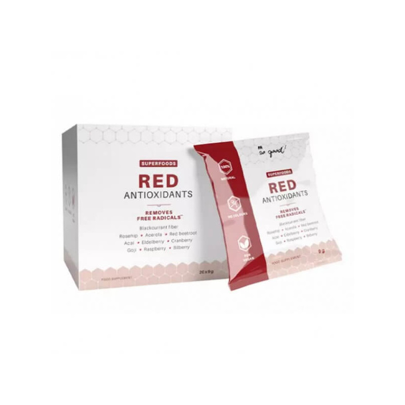 So Good! Red Antioxidants от популярного польского производителя биодобавок Fitness Authority – уникальный антиоксидантный мультикомплекс, состоящий из растительных экстрактов, порошков фруктов и ягод, а также натуральной клетчатки. Для удобства употребления продукт предлагается в виде однородного быстрорастворимого порошка с естественным, идеально сбалансированным вкусом, расфасованного в порционные пакетики-саше. Каждая упаковка содержит 20 таких саше.