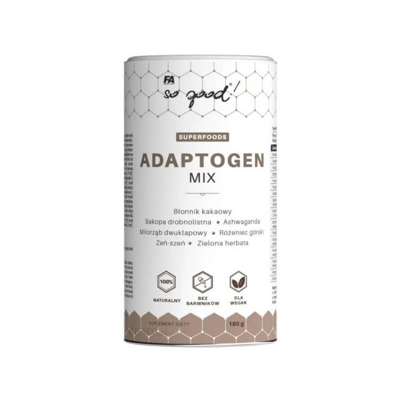 So Good! Adaptogen Mix – мощный комплексный адаптоген от популярного польского производителя Fitness Authority, представляющий собой бленд растительных экстрактов и порошков в идеальных пропорциях. Даже длительный его прием не вызывает привыкания или негативных реакций со стороны организма. А порошковая форма и нейтральный вкус делают продукт подходящим для людей с разными вкусовыми предпочтениями, а также для тех, кто имеет проблемы с приемом твердых лекарственных форм.