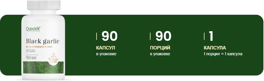 Каждая упаковка содержит 90 капсул, обеспечивая достаточное количество продукта для длительного использования. Это делает Black garlic OstroVit удобным и экономичным выбором для тех, кто стремится внедрить этот уникальный продукт в свой рацион.