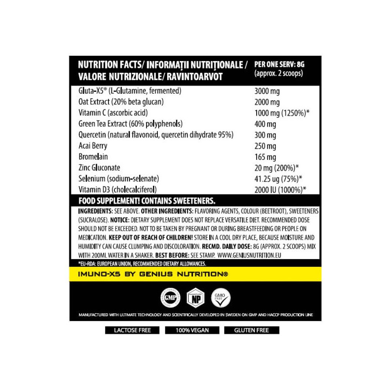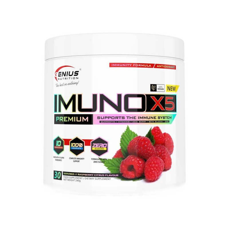 Imuno-X5 от компании из Швеции Genius Nutrition – уникальный биоактивный комплекс с иммуномодулирующим, иммуностимулирующим и антиоксидантным эффектом, изготовленный из натурального сырья и представленный в виде порошка с ярким и насыщенным фруктово-ягодным вкусом. В его состав входят природный ферментированный глутамин, витамины, минералы, растительные порошки и экстракты.