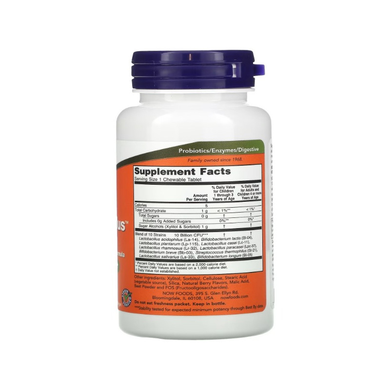 Berry Dophilus от популярного американского бренда биодобавок NOW Foods – уникальный пробиотик в жевательных таблетках с приятным и естественным ягодным вкусом. В каждой таблетке присутствует 10 штаммов полезных бактерий, которые идеально сбалансированы между собой. Бактерии, входящие в состав продукта, выращены в натуральной безопасной среде, поэтому его прием обеспечивает мощный положительный эффект. А удачно выбранная форма ягодных жевательных таблеток делает употребление биодобавки комфортным и приятным как для взрослых, так и для детей старше 2 лет.