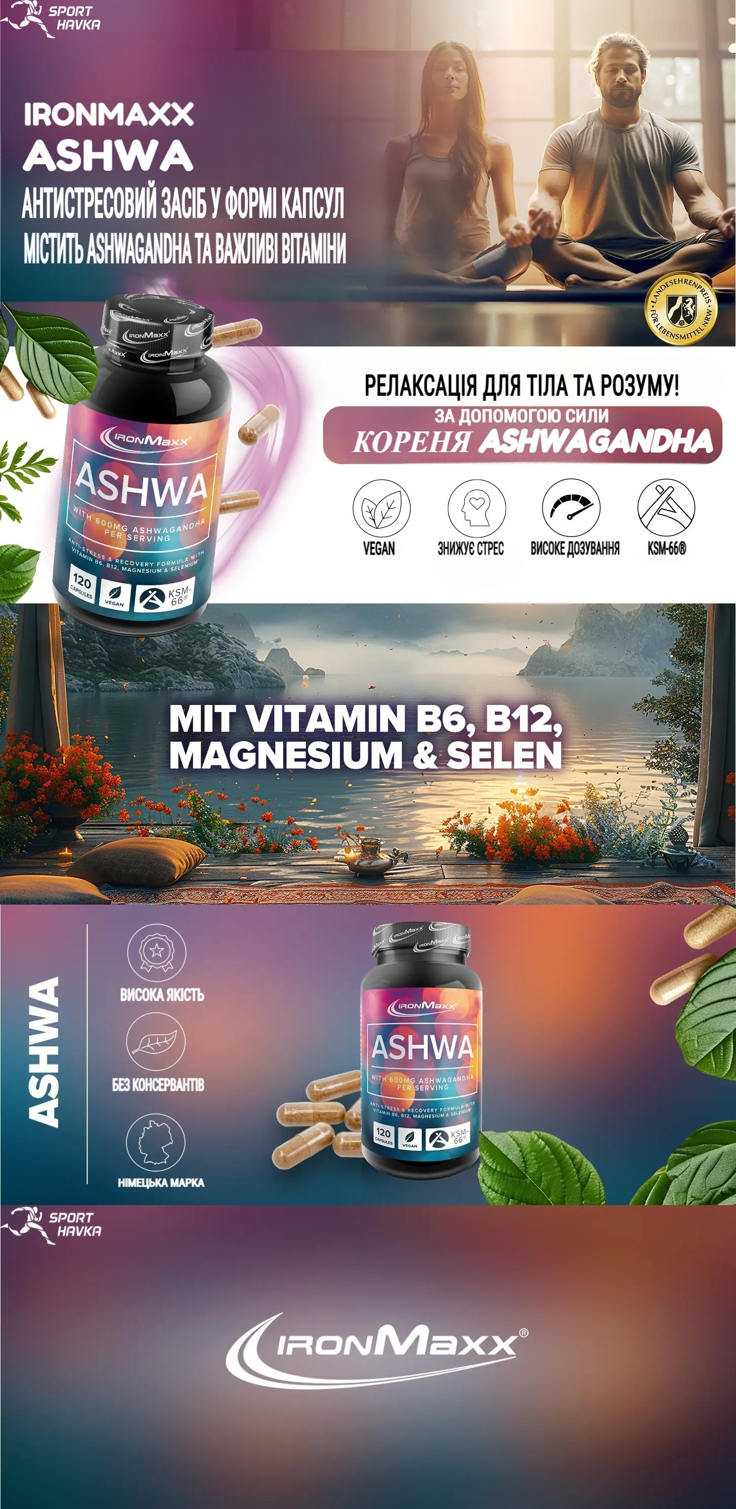 Ashwagandha IronMaxx — это высококачественная добавка, созданная для поддержки вашего здоровья и общего благополучия. Благодаря сочетанию экстракта корня ашваганды, витаминов B6 и B12, магния и селена, этот продукт помогает снизить стресс, улучшить настроение и повысить уровень энергии. Включите Ashwagandha IronMaxx в свою повседневную рутину и почувствуйте разницу уже сегодня!