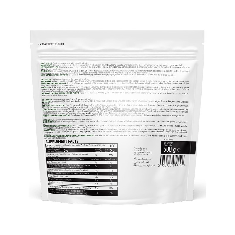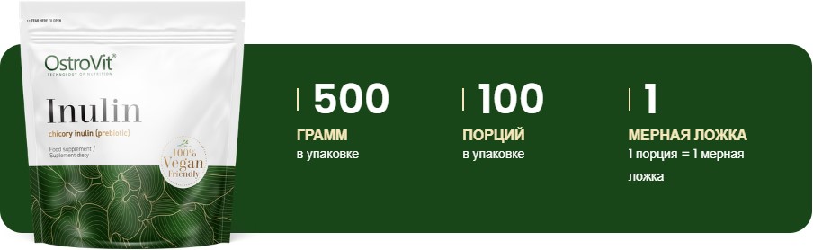 Inulin OstroVit содержит 100% чистый инулин без каких-либо добавок и консервантов. Продукт поставляется в порошкообразной форме в упаковке объемом 500 граммов. Легко растворяется в воде, соках или других напитках, а также может быть добавлен в йогурты, каши и выпечку.