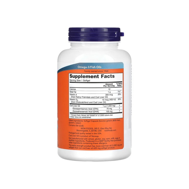 Cod Liver Oil 1000мг Now Foods в крупной упаковке на 180 капсул – идеальный источник витаминов A и D, а также омега-3 жирных кислот. Добавка помогает поддержать иммунитет, зрение и здоровье кожи. Омега-3 способствует нормализации давления и уровня холестерина. Витамин D улучшает усвоение кальция и укрепляет кости. Продукт имеет природное происхождение и проходит тщательную очистку. Не содержит рыбного привкуса или запаха. Подходит для людей, ведущих активный образ жизни. Мягкие вегетарианские капсулы удобны в приеме. Подходит для длительного курса поддержания организма. Это современное решение для сохранения жизненного тонуса и долголетия.