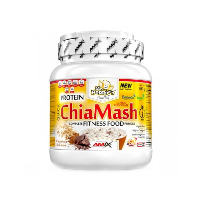 Protein Chia Mash от популярного британского производителя Amix из линейки Mr.Popper's – идеально сбалансированный белковый продукт, в состав которого входят изолят сывороточного протеина, семена чиа и золотого льна, овсяные хлопья и кусочки натуральных фруктов. Он представлен в виде порошка, из которого можно быстро и легко приготовить вкусное, полезное и сытное пюре со вкусом двойного шоколада. Также протеиновый порошок можно добавлять в каши, выпечку, белковые батончики и другие блюда.